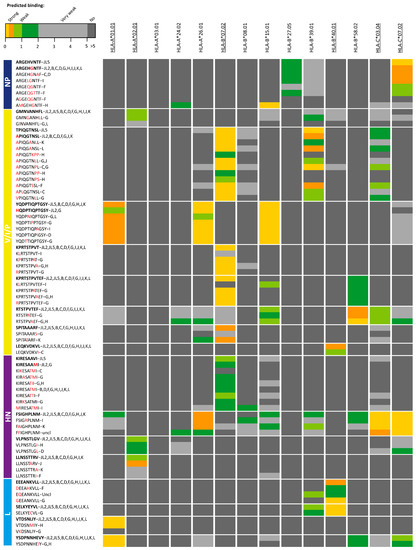 Sequence differences in CD8+ T cell epitopes between vaccine and wild-type MuV strains may lead to diminished recognition of wild-type mumps MuV by T cells that were induced by vaccination. Cytotoxic CD8+ T cells recognize epitopes presented by HLA-I molecules on the surface of cells. HLA molecules display extensive polymorphism in domains responsible for antigen binding and interactions with variable regions of the T cell receptors. The selection of epitopes that is presented markedly varies across the different HLA alleles. However, several HLA-I supertypes have been described that represent a group of HLA molecules which bind to a similar set of peptides. Immunoinformatic tools can predict the binding affinity of peptides to the various HLA molecules. In recent years, the accuracy of these in silico prediction methods has increased strikingly [19]. In the present study, we used the NetMHC-pan-4.1 tool to predict the binding of the identified T-cell epitope candidates derived from the JL vaccine MuV. Epitope binding was predicted to all HLA-I (A and B) supertypes, i.e., HLA-A*01:01, HLA-A*02:01, HLA-A*03:01, HLA-A*24:02, HLA-A*26:01, HLA-B*07:02, HLA-B*08:01, HLA-B*27:05, HLA-B*39:01, HLA-B*40:01, HLA-B*58:01, HLA-B*15:01 as well as to the two HLA-C alleles, HLA-C*03:04, or HLA-C*07:02 that were expressed on the antigen-presenting cells used to identify the MuV epitope candidates. In addition, we explored whether observed differences in amino acid sequences within the potential T cell epitopes among various wild-type MuV strains led to differences in predicted HLA-I binding.