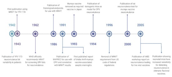 While the MNVT is widely used, it has several shortcomings. Rubin et al. explored these shortcomings specifically regarding neurovirulence testing for mumps vaccines [36], though some of these issues are common for other live viral vaccines. For mumps vaccines, the MNVT only showed non-significant trends towards differences between wild-type and attenuated mumps viruses and failed to detect residual neurovirulence in the Urabe Am9 strain of mumps vaccine [37]. This strain was developed in 1967 based on a Japanese isolate of mumps virus, passaged through chicken and quail cells [38]. The vaccine was widely distributed in Canada, Japan, and Europe until cases of vaccine-associated aseptic meningitis were detected in Canada. More cases were found in Japan and the UK, with an estimated 38–330 cases of aseptic meningitis per 100,000 vaccine recipients [39]. Following these findings, the Urabe Am9 vaccine saw reduced use, and in Japan, mumps was removed as a routine vaccine altogether. Following this policy change, Japan has seen a surge in mumps cases, with up to 1.5 million infections annually [40,41]. The non-translational results of the MNVT led to the scientific community revisiting the value of the MNVT for vaccine safety testing, and in 2005, the International Alliance for Biological Standardization (IABS) released a report on neurovirulence tests for live attenuated vaccines. This workshop report concluded that the monkey neurovirulence test was useful for testing YFV and poliovirus vaccines but was questionably useful for most of the viruses for which it is currently used, including mumps, measles, rubella, influenza, and varicella [21]. The history of the MNVT, these reports, and the development of alternative models in recent years are summarized in Figure 1.
