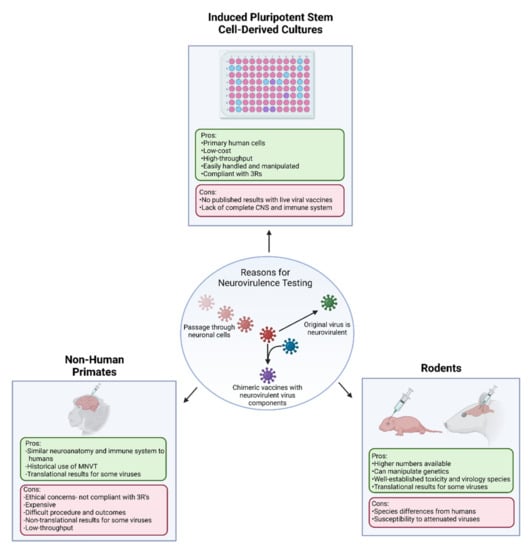 Human induced pluripotent stem cells (hiPSCs) are an emerging technology that have been developed for multiple organs. To create hiPSCs, fibroblasts are harvested from patients, then induced to become stem cells, which can then be differentiated into human cells in culture. The stem cells can be maintained in culture precluding the need for repeated harvesting of stem cells. This process allows for the study of primary human cells without needing to collect them from patients and allows for larger scale studies as the populations can be grown in vitro. The opportunities for hiPSC-derived neural cell lines in studying virus-CNS interactions have been reviewed by Harschnitz and Studer [96]. Notable conclusions from that paper that should be considered are that the hiPSC models allow for scalability and flexibility in models; that they allow for high-throughput screening; and that they more closely mimic the immune responses of cells of the central nervous system than other models. All of these factors indicate that they would be potential models for use in determining the neurovirulence of live viral vaccines.