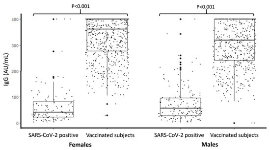IgG concentration (AU/mL) in subjects positive for SARS-CoV-2 and in vaccinated subjects stratified by sex (LOD < 3.8 and >400 AU/mL).