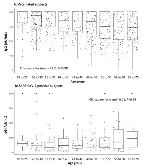 IgG concentration (AU/mL) in vaccinated subjects (A) and in those positive for SARS-CoV-2 (B) according to the age group (LOD <3.8 and >400 AU/mL).
