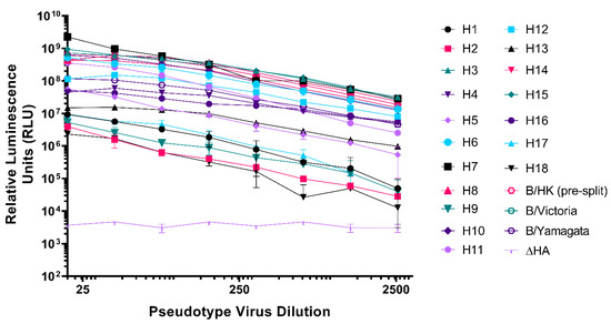 Titration of representative Influenza A (H1-H18) and influenza B (presplit, B/Victoria-like and B/Yamagata-like lineages) viruses. Pseudotyped lentiviral particles with HA envelopes: H1—A/England/195/2009(H1), H2—A/quail/Rhode Island/16-0186222-1/2016(H2), H3—A/ruddy turnstone/Delaware Bay/606/2017(H3), H4—A/green-winged teal/California/K218/2005(H4), H5—A/gyrfalcon/Washington/41088-6/2014(H5), H6—A/American wigeon/California/HS007A/2015(H6), H7—A/Shanghai/2/2013(H7), H8—A/mallard/Netherlands/7/2015(H8), H9—A/chicken/Israel/291417/2017(H9), H10—A/duck/Bangladesh/24268/2015(H10), H11—A/red shoveler/Chile/C14653/2016(H11), H12—A/northern shoveler/Nevada/D1516557/2015(H12), H13—A/laughing gull/New Jersey/UGAI7-2843/2017(H13), H14—A/mallard/Astrakhan/263/1982(H14), H15—A/duck/Bangladesh/24697/2015(H15), H16—A/black-headed gull/Netherlands/1/2016(H16), presplit—B/Hong Kong/8/1973, B/Victoria—B/Brisbane/60/2008, and B/Yamagata—B/Phuket/3073/2013, were titrated in HEK293T/17 cells. H17—A/little yellow-shouldered bat/Guatemala/60/2017(H17), and H18—A/flat-faced bat/Peru/33/2010(H18) were titrated in MDCKII cells. ΔHA is included as a no envelope control. Each point represents the mean and standard deviation of two replicates per dilution (n = 2). Readout is expressed in relative luminescence units (RLU).