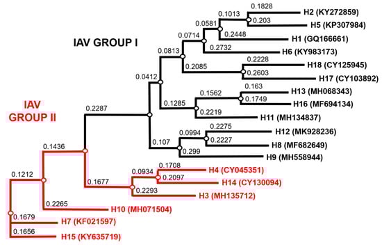 Phylogenetic tree of representative IAV HA from the PV library constructed as shown in Figure 3 and Table 3. Influenza A Group I HA PV are shown in black and IAV Group II PV in red. Accession numbers are reported with the subtype on the tree tips. Nodes are shown at the ends of branches, which represent sequences or hypothetical sequences at various points in evolutionary history. Branch lengths indicate the extent of genetic change. The tree generated was constructed with PhyML on the Influenza Research Database (IRD) [72] and graphically elaborated with Archaeopteryx.js (https://sites.google.com/site/cmzmasek/home/software/archaeopteryx-js) (access on 3 April 2021).