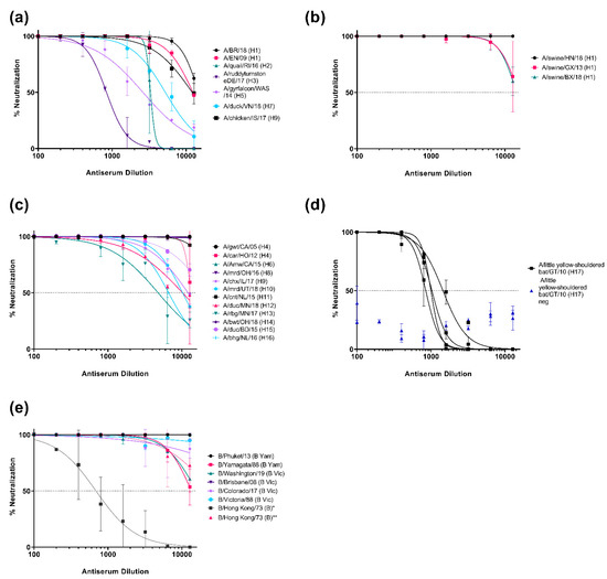 The neutralization susceptibility of representative PV generated to the available HA subtype specific reference antisera (Table 2) was assessed. All reference antisera were able to neutralize the subtype homologous PV they were tested against (Figure 5). We showed neutralization dose response curves for PV representing IAV strains, which were reported as the cause of human disease, including avian subtypes that caused zoonotic infection without being associated with sustained human to human transmission (HPAI H5 and H7, and H9), with IC50 dilution values ranging from the most potent, ~14521 for H1, and the least potent, ~416 for H3 (Figure 5a). We also tested against HA PV that have been associated with swine and human infection, such as H1 strains that have been found in pigs, which may acquire the ability to transmit to humans due to possible antigenic shift (Figure 5b), and avian IAV subtypes that are found in their natural reservoir, wild, and occasionally domesticated, birds (Figure 5c) and may evolve in the future to cause novel pandemic strains in humans. Antisera used herein have IC50 dilution values that are comparatively higher than the IC50 values for HA subtypes associated with human disease (ranging from ~13,000 for H14 to ~900 for H13). Currently there is no commercially available H17 or H18 subtype antisera. Due to the association of H17 in frugivorous bat species, sera collected from bats in Nigeria, as provided by the Animal and Plant Health Agency (APHA), were assessed against the H17 pseudotype (Figure 5d). Three bats within a larger panel (only five samples shown here) neutralized the H17 PV with similar IC50 dilution values of 537, 645, and 724, respectively. (Figure 5d). Human IBV PV from both Yamagata and Victoria-like lineages were also susceptible to neutralization from reference antisera (Figure 5e). Antisera to pre-split IBV strains were not available for this study, nonetheless, our representative pre-split IBV (B/Hong Kong/73) strain was neutralized by both anti-Yamagata and anti-Victoria reference sera. However, this PV was more susceptible to neutralization by antisera generated using HA from the Victoria-like lineage than the Yamagata-like lineage (Figure 5e), with IC50 dilution values of 688.8 and >10,000, respectively. All antisera IC50 dilutions are reported in Table S2.
