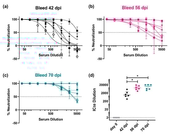 In vitro neutralizing activity of mouse sera against A/England/195/09 (H1) (EN/09) as monitored at specific timepoints during the immunization protocol. Mice were vaccinated with 50 µg of pEVAC EN/09 (H1) on days 0, 14, 28, and 42 (Figure 1). Bleeds were taken (a) 42 days post immunization (dpi), (b) 56 dpi, and (c) 70 dpi (terminal bleed). Neutralizing activity was tested against 1 × 106 RLU of A/England/195/09 (H1) PV. (d) Comparison of the half maximal inhibitory dilutions (IC50) in post-vaccination samples as a function of time is shown in brackets (* p < 0.05). The broken line shows an assigned baseline level of 2 indicating 0% neutralization. For plots (a–c), the mean and standard deviation of individual mouse serum samples are shown (n = 6). Plot (d) shows the median and interquartile range of samples tested.