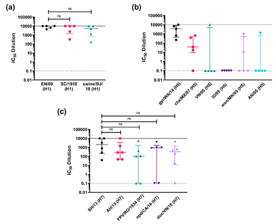 In vitro neutralizing activity as shown by IC50 dilution of mouse sera vaccinated with an HA subtype tested against homologous PV and representative PV strains of the same subtype. (a) Mice were vaccinated with 50 µg of pEVAC HA A/England/195/09 (H1) (EN/09) (n = 5). Terminal bleeds (70 dpi) were tested against H1 PV strains (x-axis): homologous EN/09, A/South Carolina/1/1918 (H1) (SC/1918), and A/swine/Beijing/301/18 (H1) (swine/BJ/18). (b) Mice were vaccinated with 50 µg of pEVAC HA A/gyrfalcon/Washington/41088-6/14 (H5) (gyr/WA/14) (n = 5). Terminal bleeds (70 dpi) were tested against H5 PV strains (x-axis): homologous gyr/WA/14, A/chicken/Mexico/7/07 (H5) (chx/MX/07), A/Indonesia/5/05 (H5) (ID/05), A/Vietnam/1203/04 (H5) (VN/05), A/whooper swan/Mongolia/244/05 (H5) (wsn/MN/05), and A/Anhui/1/05 (H5) (AN/05). (c) Mice were vaccinated with 50 µg of pEVAC HA A/Shanghai/2/13 (H7) (SH/13) (n = 6). Terminal bleeds (70 dpi) were tested against H7 PV strains (x-axis): homologous SH/13, A/Anhui/1/13 (H7) (AH/13), A/FPV/Rostock/1934 (H7) (FPV/RO/1934), A/northern pintail duck/California/UCD1582/16 (H7) (npd/CA/16), and A/duck/Vietnam/HU10-64/18 (H7) (duc/VN/18). For all plots, the median and interquartile range of individual mouse serum samples per immunization group are shown. The solid line indicates an assigned maximum IC50 dilution of 10,000 showing 100% neutralization and the broken line shows an assigned baseline level of 0.1 indicating 0% neutralization (cell only mean). Comparisons of no significant difference (ns: p > 0.05) against the homologous PV are shown in brackets.
