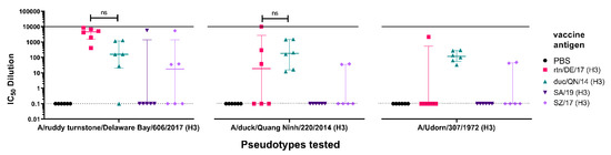 In vitro neutralizing activity as shown by IC50 dilution of mouse sera vaccinated with avian and human pEVAC H3 vaccine antigens tested against homologous avian H3 PV and a representative human PV strain of H3. Four groups consisting of 6 mice each (n = 6/group) were vaccinated with 50 µg of pEVAC HA-A/ruddy turn-stone/Delaware Bay/606/2017 (H3) (rtn/DE/17) (pink square) or HA-A/duck/Quang Ninh/220/2014 (H3) (duc/QN/14) (green triangle), HA-A/South Australia/34/2019 (H3) (SA/19) (violet inverted triangle), and HA-A/Switzerland/8060/2017 (H3) (SZ/17) (purple diamond), respectively. An additional group of mice was vaccinated with PBS (negative control group) (n = 6). Terminal bleeds (70 dpi) were tested against H3 PV strains: 2 homologous avian PV, rtn/DE/17 and duc/QN/14, and one human PV, A/Udorn/307/1972 (UD/1972), as shown in the x-axes. For all plots, the median and interquartile range of individual mouse serum samples per immunization group are shown. The solid line indicates an assigned maximum IC50 dilution of 10,000 showing 100% neutralization and the broken line shows an assigned baseline level of 0.1 indicating 0% neutralization (cell only mean). Comparisons of no significant difference (ns: p > 0.05) against the homologous PV are shown in brackets.