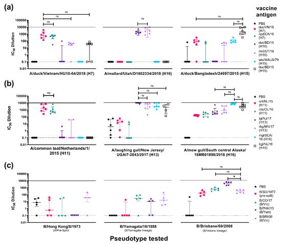 In vitro neutralizing activity as shown by IC50 dilution of mouse sera vaccinated with HA antigens from the closest phylogenetically related IAV subtypes, (a) H7, H10, and H15, (b) H11, H13 and H16, and (c) IBV HA antigens from pre-split, Yamagata and Victoria like-lineages. Neutralizing activity of sera from vaccinated mice were tested against homologous and heterologous strains from the same subtype and a representative strain within the related subtypes. (a) IAV H7/H10/H15 study. Six groups consisting of 6 mice each (n = 6/group) were vaccinated with 50 µg of pEVAC expressing A/duck/Vietnam/HU10-64/2018 (H7) (duc/VN/18) (pink square), A/northern pintail duck/California/UCD1582/2016 (H7) (npd/CA/16) (green triangle) (n = 6), A/duck/Bangladesh/24268/2015 (H10) (duc/BD/15) (violet inverted triangle), A/mallard/Utah/D1802334/2018 (H10) (mrd/UT/18) (purple diamond), A/wedge-tailed shearwater/Western Australia/2576/1979 (H15) (wts/WAUS/79) (light blue circle), and A/duck/Bangladesh/24697/2015 (H15) (duc/BD/15) (hollow black square), respectively. Terminal bleeds (70 dpi) were tested against H7 PV duc/VN/18, H10 PV mrd/UT/18, and H15 PV duc/BD/15 as shown on the x-axes. (b) IAV H11/H13/H16 study. Six groups consisting of 6 mice each (n = 6/group) were vaccinated with 50 µg of pEVAC cloned with A/common teal/Netherlands/1/2015 (H11) (cnt/NL/15) (pink square), A/red/shoveler/Chile/C14653/2016 (H11) (rds/CL/16) (green triangle), A/laughing gull/New Jersey/UGAI7-2843/2017 (H13) (lgl/NJ/17) (violet inverted triangle), A/ring-billed gull/Minnesota/OPMNAI0816/2017 (H13) (rbg /MN/17) (purple diamond), A/black-headed gull/Netherlands/1/2016 (H16) (bhg/NL/16) (light blue circle), and A/mew gull/South central Alas-ka/18MB01898/2018 (H16) (mgl/SCA/18) (black hollow square). Terminal bleeds (70 dpi) were tested against H11 PV cnt/NL/15, H13 PV lgl/NJ/17, and H16 PV mgl/SCA/18 as shown in the x-axes. (c) IBV cross liA neage study. Four groups of mice were vaccinated with 50 µg of pEVAC cloned with B/Singapore/222/1979 (presplit) (B/SG/1979) (pink square) (n = 5), B/Colorado/06/2017 (B/Vic) (B/CO/17) (green triangle) (n = 6), B/Phuket/3073/2013 (B/Yam) (B/PHK/13) (violet inverted triangle) (n = 6), and B/Brisbane/60/2008 (B/Vic) (B/BRI/08) (purple diamond) (n = 6), respectively. Terminal bleeds (70 dpi) were tested against a representative B pre-split PV, B/Hong Kong/8/1973, a representative B/Yamagata PV, B/Yamagata/16/1988, and B/Victoria PV B/Brisbane/60/2008 as shown in the x-axes. For all plots, an additional group of mice was vaccinated with PBS (n=5/6). Plots show the median and interquartile range of individual mouse serum samples per immunization group. The solid line indicates an assigned maximum IC50 dilution of 10,000 showing 100% neutralization and the broken line shows an assigned baseline level of 0.1 indicating 0% neutralization. Comparisons of no significant difference (ns: p > 0.05) and significant difference (* p < 0.05) among IC50 dilution values with antigen homologous to the PV being tested against is shown in brackets. In the case of (c), comparison is made with neutralization of the antigen belonging to the same lineage as the PV it is tested against.
