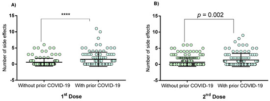 Side effects to Pfizer–BioNTech vaccine in patients with and without prior COVID-19. (A) Side effects to a first dose; (B) Side effects to the second dose. Data were calculated using the Mann–Whitney U-test. Values are provided as medians and interquartile ranges. **** p < 0.0001.