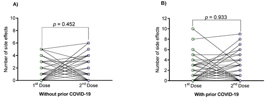 The number of vaccine-associated side effects of individuals with or without prior COVID-19 was also analyzed individually at the first and second doses (Figure 2). Regarding this, no trend was observed towards an increase or decrease in the number of side effects after the first and second doses (p > 0.05).