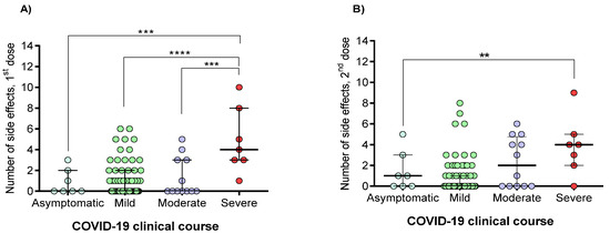Relationship between prior COVID-19 clinical course with the number of vaccine-associated side effects. (A) Side effects after a singles dose; (B) Side effects after the second dose. The difference between all groups was calculated with the Kruskal–Wallis test, followed by Dunn’s multiple comparison test. Data are provided as median and interquartile ranges. **, p < 0.01; ***, p < 0.001; ****, p < 0.0001.