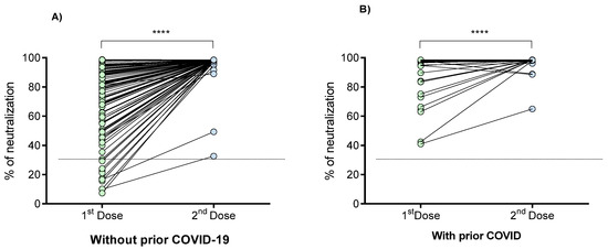 Percentage of neutralizing signal of antibodies generated in response to the BNT162b2 vaccine in individuals with and without prior COVID-19. (A) Individuals without prior COVID-19; (B) Individuals with prior COVID-19. Differences were calculated by the Wilcoxon signed-rank test. The dotted line indicates the cut-off point for the neutralization test (>30%). ****, p < 0.0001.