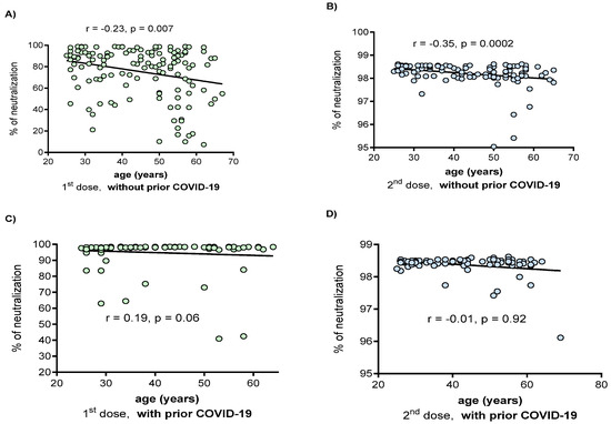 Correlation between the age and neutralization percentage in vaccinated individuals with and without prior COVID-19. (A) the first dose in patients without prior COVID-19; (B) the second dose in patients without prior COVID-19; (C) the first dose in patients with prior COVID-19; (D) the second dose in patients with prior COVID-19. Correlations were evaluated by the Spearman test. Outliers were removed for data analysis.