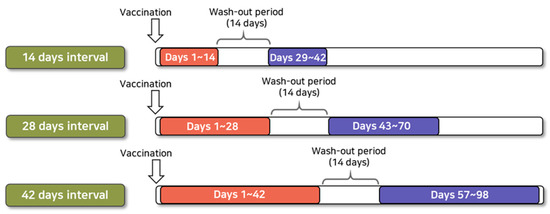 As a primary analysis, we used a risk interval of 1–42 days following influenza vaccination and a control interval of 57–98 days following influenza vaccination, referring to previous case reports of Bell’s palsy after receiving vaccination and studies using large databases conducted in other countries (Figure 1). In addition, sensitivity analyses were performed to ensure the robustness of study results by selecting other control intervals. We used risk intervals of 1–14 days and 1–28 days following the vaccination and control intervals of 29–42 days and 43–70 days following influenza vaccination for sensitivity analyses. We set a 14-day washout period between risk and control intervals in all analyses.