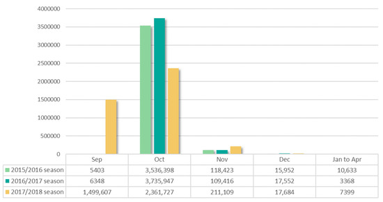 We identified 4,653,440 elderly patients who received influenza vaccinations during the study period. A total of 11,656,966 doses of influenza vaccine were administered to the study population (Table 1). The number of the elderly patients who met our inclusion criteria and received at least one influenza vaccine during the seasonal period was 3,686,809 in the 2015/2016 season, 3,872,631 in the 2016/2017 season, and 4,097,526 in the 2017/2018 season. This number increased as the season passed. More than 95% of the elderly received the vaccine in October in the 2015/2016 season and 2016/2017 season (Figure 2). However, in the 2017/2018 season, vaccination cases were high at about 36% in September, which was believed to be because the NIP of the influenza vaccine for elderly began on September 26, unlike the other seasons that began in October.