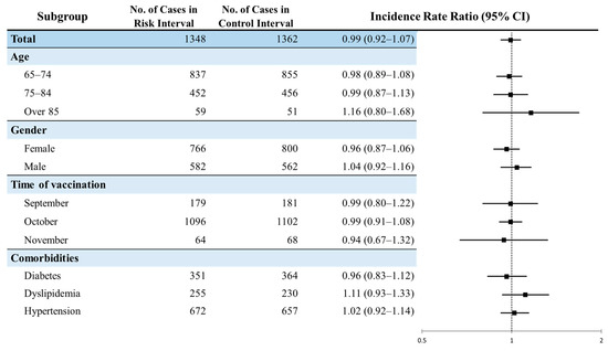 We performed subgroup analysis to investigate differences by age group, gender, the month of influenza vaccination, and the history of chronic conditions prior to vaccination. For chronic conditions, we selected diabetes, dyslipidemia, and hypertension, known to be related to the occurrence of Bell’s palsy in previous studies [8,18,26,27]. Subgroups with a history of chronic diseases were established for the elderly who were diagnosed with diabetes, dyslipidemia, and hypertension at least twice during the 6 months prior to vaccination.