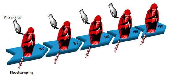 Rhesus macaque monkeys (Macaca mulatta) were obtained from the animal house of the Neuroscience Research Center of the Baqiyatallah University of Medical Sciences (Tehran, Iran). All studies on macaques were performed by an expert veterinary physician in accordance with the animal welfare guidelines approved by the Institutional Ethics Committee and Research Advisory Committee of Mashhad University of Medical Sciences, Mashhad, Iran (IR.MUMS.PHARMACY.REC.1397.113). Five 7–9 year-old-male macaque monkeys (weight: 8–11 kg) were subcutaneously vaccinated four times at 2-week intervals with the L-IFPTA formulation containing 100 µg peptide per injection. Venous blood sampling was done prior to the vaccination at week 0 and two weeks following each vaccination up to week 8 (Figure 1). Redness, swelling or induration at the vaccination site, food intake and body weight, as well as malaise, fever, shivering or rash were checked during the vaccination period.