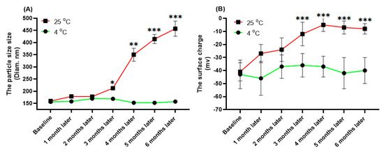 Figure 2. Evaluating the stability of L-IFPT nanoparticles by measuring changes of physical characteristics at 4 °C and 25 °C for 6 months. The physical characteristics of L-IFPT nanoparticles, including the size (A) and the surface charge (B), were not significantly changed for up to 6 months of storage at the 4 °C, while those were significantly increased after 3 months of storage at 25 °C, when compared to the baseline time point. Values are means ± SD (n = 3). Statistical differences at p-values less than 0.05 were considered to be significant. *, **, and *** signs show p = 0.03, p = 0.01, and p <0.01, respectively.