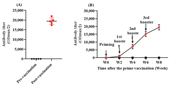 Figure 3. (A) Antibody titer (ODmax/2) against PCSK9 in vaccinated monkeys at pre-vaccination (W0) and post-vaccination (W8) time-points. (B) The exponential increase in antiPCSK9 antibody titer (ODmax/2) over 8 weeks post prime vaccination, generated upon 4 vaccinations in a biweekly interval (signed by arrows). Values are means ± SD (n = 5).