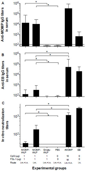 Serum antibody titers. (A) Anti-C. muridarum MOMP and (B) anti-C. muridarum EB IgG antibody titers. (C) In vitro neutralizing C. muridarum EB titers. Serum samples were collected before immunization as background control, and antibody titers were determined the day before the i.n. challenge. Horizontal dotted lines represent the limit of detection. * p < 0.05 by ANOVA.