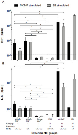 Levels of (A) IFN-γ and (B) IL-6 produced by T cells stimulated with EB or MOMP/APols the day before the C. muridarum i.n. challenge. The day before the challenge, mice were euthanized, their spleens collected, and T-cells purified using a nylon wool column. Purified T-cells were stimulated in vitro with C. muridarum-EB or with -rMOMP in APols. Cytokines were measure in the tissue culture supernatants. Horizontal dotted line represents the limit of detection. * p < 0.05 by ANOVA.