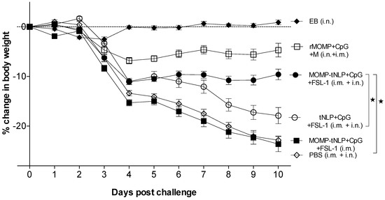 Based on body weight changes at D10 post-challenge (p.c.) mice vaccinated with MOMP-tNLP+CpG+FSL-1 via the i.m. + i.n. routes (−9.60%; p < 0.05) exhibited significant protection when compared to the control tNLP+CpG+FSL-1 immunized animals (−17.90%) (Figure 5A). However, the group immunized only i.m. was not protected (−23.63%; p > 0.05) compared to the PBS immunized group. The group vaccinated with rMOMP lost 5% of their initial body weight while the PBS group lost 23.03%. Mice immunized with EB regained their original body weight.