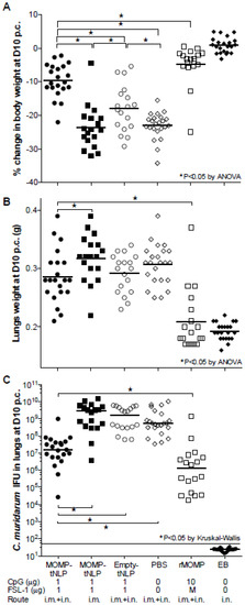 Systemic and local disease burden following the i.n. challenge with C. muridarum. (A) Percentage change in mean body weight at D10 following the i.n. challenge. The mean is shown as a horizontal line. Each symbol represents a single animal. (B) Lungs weight (g) at D10 after the i.n. challenge. The mean is shown as a horizontal line. Each symbol represents a single animal. (C) Number of C. muridarum IFU recovered from the lungs at D10 after the i.n. challenge. The median is shown as a horizontal line. Each symbol represents a single animal. * p < 0.05.