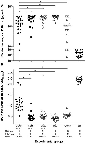 Levels of IFN-γ and titers of C. muridarum-specific IgA in the lungs at D10 p.c. (A) Levels of IFN-γ (pg/mL) detected in lung supernatants at D10 after the i.n. challenge. The mean is shown as a horizontal line. Each symbol represents a single animal. (B) Levels of C. muridarum-specific IgA (OD405) detected in lung supernatants at D10 following i.n. challenge. The mean is shown as a horizontal line. Each symbol represents a single animal. * p < 0.05.