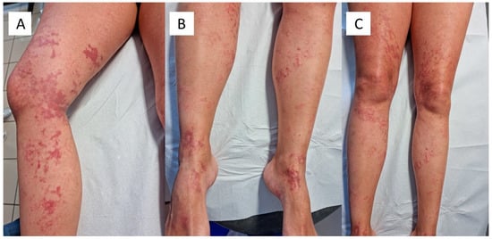 (A–C). Clinical spectrum of the purpuric rash in the lower limbs of the patient described. Note the different distribution of the lesions.