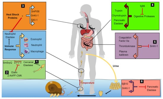 Model proposing the survival mechanisms of schistosomes within the host by protease inhibitors. The cercariae penetrate the human skin using cercarial elastase, which secretes a protease inhibitor, SmSrpQ. This regulates the production of cercarial elastase, in this way protecting the cercariae from its own elastase (1). The presence of CE inhibitors, Elafin and Z-AAPF-CMK, inactivates CE, blocking SmSrpQ regulation, and thus, preventing successful host penetration (2). However, in their absence, the cercariae migrate through various tissues in the host. This stimulates an immune response in the human host, leading to the release of effector cells and specific proteases such as NE to defend the human body (2). To counteract the host’s immune response, schistosomules secrete various protease inhibitors (SmPi56, SmkI-1 and SjKI-1) and heat shock proteins to inhibit the effects of NE (3). In the small intestine (4), schistosomes escape digestion by digestive enzymes through the secretion of SjB6, which inhibits digestive proteases within the host (trypsin, chymotrypsin and pancreatic elastase). In the mesenteric veins of the host, adult worms prevent blood coagulation by secreting SmKI-1, which inhibits various blood-clotting factors, in this way interfering with blood flow to vital organs of the body (5). The worms survive and produce eggs to continue the infection cycle. These eggs are protected from the effects of pancreatic elastase by SjB10 and SmKI-1 (6).