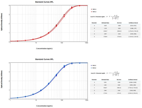 Graphical representation by a 5 Parameter Logistic (5PL) Curve of the Results for the various standard curves across the range of 1.953 ng/mL to 500 ng/mL human-specific IgG against the SARS-CoV-2 spike protein.