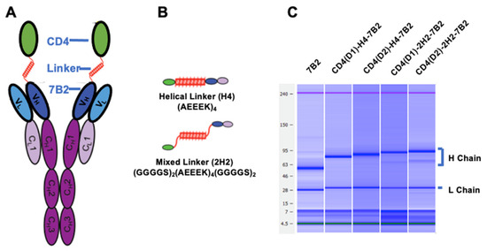Construction of Ig-adhesins (A). Schematic diagram of CD4/7B2 chimeric adhesin, showing CD4 linked to the H chain of anti-gp41 mAb 7B2 (B). Schematic diagram of linkers successfully used to join CD4 to 7B2 variable regions (C). Microcapillary electrophoresis demonstrating the molecular weights of the heavy and light chains under reducing conditions.