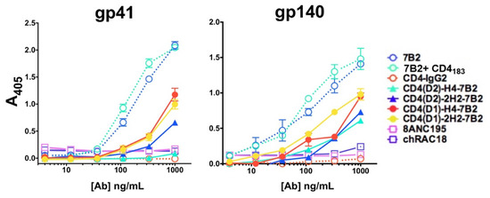 Abs and adhesins were tested by indirect ELISA for binding to the gp41 peptide representing the epitope bound by mAb 7B2 or to trimeric gp140. The gp41 peptide is a linear sequence [LGIWGCSGKLICTT]. Gp140 is trimeric, folded SF162 [NIH-ARP and a gift from Dr. L. Stamatatos, [62]]. Immulon 2HB plates (Thermo, Waltham, MA, USA) were coated with 0.1 µg/100 µL of peptide or 0.05 µg/100 µL of recombinant antigen, and the assay performed as described elsewhere [24]. The binding of immunoadhesins or mAbs was detected using AP-conjugated goat anti-human IgG (H + L chain specific) secondary Ab and 0.5 mg/mL of chromogenic substrate p-nitrophenyl phosphate in succession. ELISA plates were read at 405 nm at room temperature in a BioTek EL320 microplate reader (BioTek, Winooski, VT, USA). Data are presented as the mean and SEM of triplicate assays.