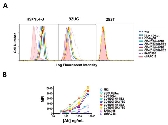 H9/NL4-3, HEK293T, and 293/92UG cells (1 × 105) were stained for flow cytometry in 200 µL round bottom 96-well plates (Costar, Lowell, MA, USA). Serial dilutions of test reagent in PBS, 1% bovine serum albumin, 0.01% Na azide were added to the cells. Cells were incubated for 2 h at room temperature, washed, stained with FITC-conjugated goat anti-human IgG (H + L chain specific) secondary Ab for 2 h, and then washed twice and fixed in 100 µL of 2% paraformaldehyde (PFA). Cells were analyzed on a Becton-Dickinson LSR II. A total of 10,000 events was collected and the data analyzed using FloJo software (Treestar, Ashland, OR, USA). Forward scatter (FSC) and side scatter (SSC) gated data are presented as histograms or graphs of mean fluorescence intensity.