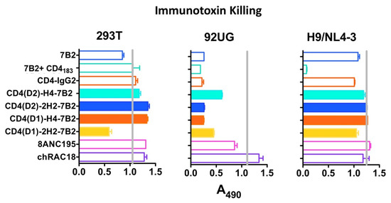 - Pincus, S.H.; McClure, J. Soluble CD4 enhances the efficacy of immunotoxins directed against gp41 of the human immunodefi-ciency virus. Proc. Natl. Acad. Sci. USA 1993, 90, 332–336. [Google Scholar] [CrossRef]