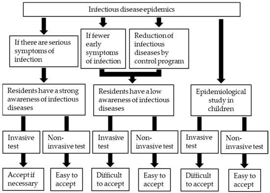 There are three major advantages of using urine samples compared to serum in epidemiological studies. First, urine can be collected noninvasively. In general, antibody examinations use serum separated from blood samples. However, with blood sampling, it is difficult to obtain the cooperation of people due to the invasiveness, especially in situations in which the target population has less interest in the infectious disease, the epidemic is being contained by control programs, or the target population is children (Figure 1). For these reasons, noninvasive methods for epidemiological studies can easily obtain the cooperation of residents, and the urine-based antibody examination is the first candidate for this purpose. Second, urine can be collected at a low cost. Syringes, lancets, and deployment of medical personnel for blood collection are not required. Urine samples can be collected with the help of volunteers, such as villagers, schoolteachers, and even senior students; thus, study costs will be cut down. Third, the risk of accidental infection (e.g., hepatitis B virus, HCV, or HIV-1), which sometimes happens through blood, can also be greatly reduced.