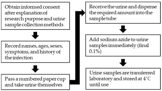 An example of the urine sample collection flow is shown in Figure 2. The purpose of survey and the urine collection method are explained to people. After obtaining informed consent, they are asked their names, ages, sexes, disease histories, and presence of symptoms. Then, paper cups are passed out for them to collect their own urine samples. Even younger elementary school children can easily collect their urine, sometimes with the help of older students.