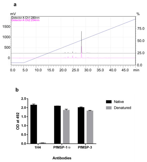 Figure 2. Characterization of purified rFu24 protein. (a) The purity of rFu24 was analyzed by RP-HPLC. Purified rFu24 eluted as a single symmetrical peak representing monomeric rFu24; (b) The conformation integrity of rFu24 under reducing and non-reducing conditions was tested with PfMSP-119 conformation-specific Mab 1H4 by ELISA. rFu24 was also probed with polyclonal anti-PfMSP-119 and PfMSP-3 mouse sera at a 1:2000 dilutions.