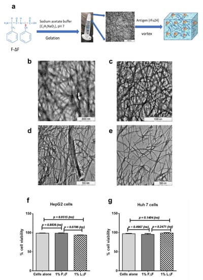 A standard solution phase synthesis procedure was used to synthesize F∆F and L∆F as described earlier [46,47,48]. Peptides were characterized by RP-HPLC and mass spectrometry (Supplementary Figure S1). The hydrogels FΔF and LΔF were spontaneously formed at 1 wt % peptide concentration and were observed to be colorless and translucent. The tube inversion test was carried out, and it was found that both gels did not flow down and thus were found to be self-supportive. (Figure 3a, Supplementary Figure S2). The ultrastructures of the hydrogels were investigated using TEM. The electron micrographs showed that both the F∆F and L∆F hydrogels had a nanofibrillar 3D mesh-like structure (Figure 3b,d). Next, we measured the viability of the Huh 7 and HepG2 cell lines after culturing the cells on 1 wt % gel by an MTT assay, to assess the biocompatibility of F∆F and L∆F. The Huh 7 cells showed 95.3 ± 2.36% and 98.9 ± 0.87% viability with F∆F and L∆F hydrogels respectively, whereas HepG2 cells showed 98 ± 0.77% and 94.0 ± 0.07% % viability with F∆F and L∆F hydrogel, respectively (Figure 3f,g). Thus, both the F-∆F and L∆F hydrogels showed no cytotoxicity at 1 wt % gels.