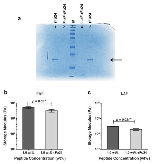 Figure 4. Entrapment of Fu24 and its rheological characterization (a) rFu24 was entrapped onto 1 wt % F∆F and L∆F hydrogels at the ratio of 1:50 (rFu24: F-∆F/L∆F). The entrapment of rFu24 by FΔF (FΔF-rFu24) and LΔF (LΔF-rFu24) is shown by SDS-PAGE. Lane 1 represents 5 µg of rFu24; lane 2 represents FΔF-rFu24; lane 3 represents the molecular weight marker in kilodaltons (kDa) (M); lane 4 represents LΔF-rFu24; and lane 5 represents 5 µg of rFu24. Mechanical strength of FΔF, LΔF, FΔF-rFu24 and LΔF-rFu24 hydrogels. (b) Storage modulus (G′ values) of FΔF and FΔF-rFu24 at 1 wt % and (c) LΔF and LΔF-rFu24 at 1 wt %. Graphs represent mean ± standard deviation (n = 3). * significant at p < 0.05.
