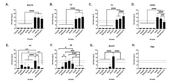 Serum HAI antibody titers post vaccination against a panel of H1N1 viruses. Immunologically naive BALB/c mice were vaccinated three times at 4-week intervals with Y2, Y4, P1, and X6 COBRA H1N1 VLP vaccines or H1N1 wild-type Bris/07, CA/09, or Bris/18 VLP vaccines, and sera were collected on week 10 post first-vaccination for HAI assay against a panel of 7 H1N1 influenza viruses. (A) Bris/19; (B) Y2; (C) Y4; (D) CA/09; (E) P1; (F) X6; (G) Bris/07; (H) PBS. Y axis indicates the log2 HAI titers for each vaccinated group and presents them as absolute mean values ± SEM. The dotted lines indicate HAI titers ranging from 1:40 (lower line) and 1:80 (upper line). HAI titers were statistically analyzed using nonparametric one-way ANOVA by GraphPad Prism 9 software (GraphPad, San Diego, CA, USA). A p value of less than 0.05 was defined as statistically significant (*, p < 0.05; **, p < 0.01; ***, p < 0.001; ****, p < 0.0001).