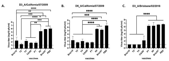In order to assess the viral titers in lung tissues after infection, three mice from each group were sacrificed on day 3 and day 6 post infection, and the virus titer of CA/09 virus in the lung tissues was evaluated (Figure 3). PBS-vaccinated mice had the highest lung viral titers (1.32 × 106 PFU/mL) on day 3 post infection, and mice vaccinated with Bris/07 and X6 had statistically similar lung viral titers compared to the PBS-vaccinated mice (Figure 3A). However, Y2-vaccinated mice had the lowest lung viral titers (20 pfu/mL), which are statistically similar with that of CA/09 and P1-vaccinated mice (less than 50 pfu/mL), while mice vaccinated with Y4 and Bris/18 HA vaccines had a 4-log decrease in lung viral titers (average of 1.99 × 102 to 2.51 × 102 PFU/mL) compared to mice vaccinated with PBS. Lung viral titers on day 6 post infection were also determined, and the titers were statistically similar with those detected on D3 post infection (Figure 3B).
