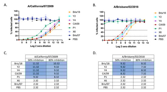 To evaluate the neutralizing activity of antibodies elicited by next generation H1N1 COBRA vaccines, a focus reduction assay was used to assess neutralizing titers against challenge virus as well as more recent circulating H1N1 viruses in vitro (Figure 5). Mice vaccinated with PBS, wild-type Bris/07 VLP, and COBRA X6 VLP vaccines did not have detectable neutralizing antibody titers against either CA/09 virus (Figure 5A) or Bris/18 virus (Figure 5B). Mice vaccinated with COBRA Y2 and Y4 VLP vaccines had high neutralizing antibody titers against both CA/09 and Bris/18 viruses. Antisera from COBRA Y2- and Y4 VLP-vaccinated mice had a log2 titer of 11.32 (50% inhibition) against CA/09 virus (Figure 5C) and log 2 of 9.32 (50% inhibition) against the Bris/18 virus (Figure 5D), which was equal to that elicited by their homologously matched HA VLP vaccines. However, mice vaccinated with the COBRA P1 VLP vaccine had high neutralizing titer (50% and 80% inhibition) against the CA/09 virus (Figure 5A,C), but no detectable neutralizing antibody titer against Bris/18 virus (Figure 5B,D). Neutralizing antibodies elicited by the CA/09 vaccine had high cross reactivity with those induced by Bris/18 vaccine. The mice vaccinated with CA/09 had a lower log2 (50% and 80% inhibition) titer against the Bris/18 virus than those in mice vaccinated with the Bris/18 vaccine (Figure 5D), while Y2 and Y4 VLP elicited neutralizing antibody titers against the CA/09 and Bris/18 viruses that were equivalent to those elicited by their homologous vaccines.