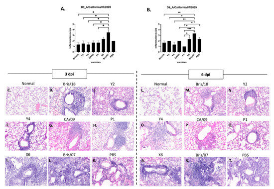 Lung inflammation in mice after A/California/09/2007 virus infection. Three mice from each group were sacrificed at day 3 and 6 post infection; left lungs were inflated with 10% buffered formalin, and then embedded into paraffin blocks. H&E staining was performed on 3 sectional slides for each mouse lung sample. (A). The inflammation score of day 3 post infection with CA/09. (B). The inflammation score of day 6 post infection with CA/09. (D–K) Representative images of inflammatory infiltration at day 3 post infection in mice vaccinated with (D) Bris/18, (E) Y2, (F) Y4, (G) CA/09, (H) P1, (I) X6, (J) Bris/07, and (K) PBS. (M–T) Representative images of inflammatory infiltration at day 6 post infection in mice vaccinated with (M) Bris/18, (N) Y2, (O) Y4, (P) CA/09, (Q) P1, (R) X6, (S) Bris/07, and (T) PBS. (C,L) Normal mouse lung (no vaccination or infection). Each slide was screened under 20X magnification (scale bar indicated 200 µm) and Inflammation scores are determined as follows: 0 = unremarkable; 1 = <25% of the tissue affected; 2 = 25–50% of the tissue affected; 3 = 50–75% of the tissue affected; 4 = >75 of the tissue affected. One-way ANOVA was used to analyze statistical differences of lung inflammation scores by GraphPad Prism 9 software (GraphPad, San Diego, CA, USA). A p value less than 0.05 was defined as statistically significant (*, p < 0.05; **, p < 0.01; ***, p < 0.001; ****, p < 0.0001).
