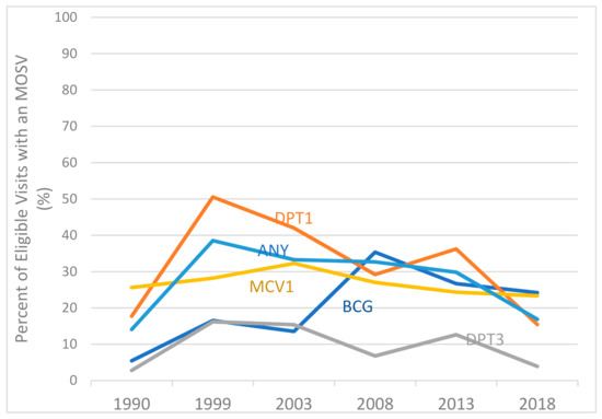Percentage of eligible vaccination visits with a MOSV for BCG, DPT, MCV or any of the basic EPI vaccines, children aged 12–23 months, Nigeria 1990–2018.