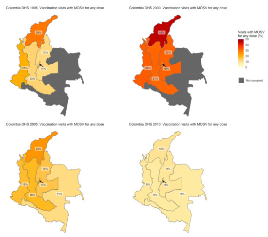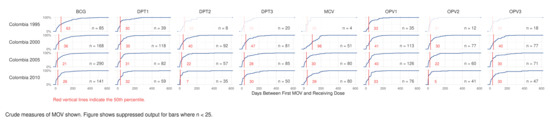 In 2015, the World Health Organization (WHO) commissioned a set of specifications for immunization system performance indicators that can be calculated using vaccination coverage survey data. The resulting freely available documents and software are called the Vaccination Coverage Quality Indicators (VCQI (pronounced “Vicki”)) and can be calculated with any dataset that records children’s date of birth and dates of vaccination [20,22,23]. In this paper, we present results on trends in MOSVs in Colombia, a country with high coverage and no endemic measles transmission, and Nigeria, a country with low overall vaccine coverage and endemic measles transmission. We describe how VCQI’s MOSV indicators can serve as one form of standardized analysis to look for meaningful differences in MOSV prevalence across space and time and show examples of different ways to present results on MOSVs and their implications for population protection from vaccine-preventable diseases (VPDs). We discuss some challenges in calculating and interpreting MOSVs and suggest directions for future work.