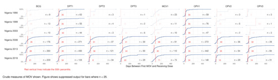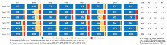 This study has several strengths. It uses publicly available data and publicly available auditable Stata programs to conduct standard analyses according to definitions from the recently updated WHO reference manual [42]. The VCQI software eliminates nonsensical vaccination dates before identifying MOSVs, converting them to tick marks so the child receives credit for receiving the dose. However, dates that are obviously wrong (vaccination before birth, vaccination after the survey, vaccination series dates out-of-order or series with the same date for consecutive doses, etc.) do not enter the analysis. The analyses are consistent across time and countries, which has been a notable challenge [13]. The Nigeria analysis uses data from IPUMS which is coded consistently so data from five surveys spanning nearly twenty years can be analyzed using a single set of VCQI analysis parameters.