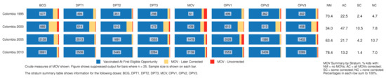 In Colombia, Figure 4 shows that apart from 2000, the proportion with at least one MOSV was between 22 and 37% and most MOSVs were corrected. Encouragingly, there were very few MOSVs for MCV in the later surveys (details and subnational results appear in supplementary Figure SC.3 and Tables SC.3a and SC.3b).