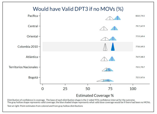 This measure of MOSV potential consequence is most meaningful in studies with high card availability. The weighted estimate of cards seen was 83.2% in Colombia in 2010, hence the results for that year are presented here. Figure 5 indicates that estimated valid dose coverage for DPT3 would have been 8.5% higher in Colombia in 2010 if the children in the survey had received DPT appropriately at every eligible visit with no early doses and no MOSVs. (Early doses represent about 3/8 ths of the 8.5% possible improvement.) The observed estimate of valid coverage was 69.3% instead of the counterfactual, but maybe achievable 77.8%. The highest difference was in the Central region (11.8%) and smallest in Territorios Nacionales (2.8%). (National results for other doses appear in Supplementary Table SC.4. Nigeria’s results appear in Table SN.4.)