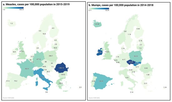 Migration may be another reason for the wide variation regarding the measles incidence rate. For example, Italy—where high incidence rates were reported for measles, mumps, and rubella—is a country with a large number of foreign residents who arrive from outside the EU, including, among others, North Africa []. Unfortunately, most European countries screening migrants focus on single diseases only, mainly active or latent tuberculosis, and are particularly targeted at asylum seekers or refugees. Screening for other diseases, including VPCD, is rare []. The subject requires further research. Czech studies show a poor response to mumps vaccination [,].